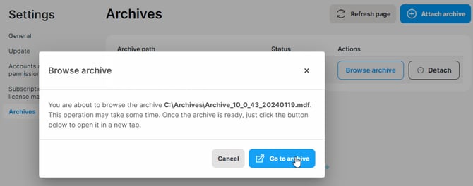 - Ready: Archive is ready to be browsed by the admin, buttons Browse archive and Detach are enabled.