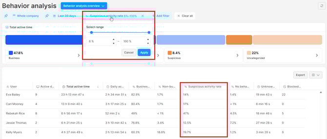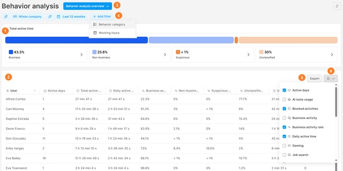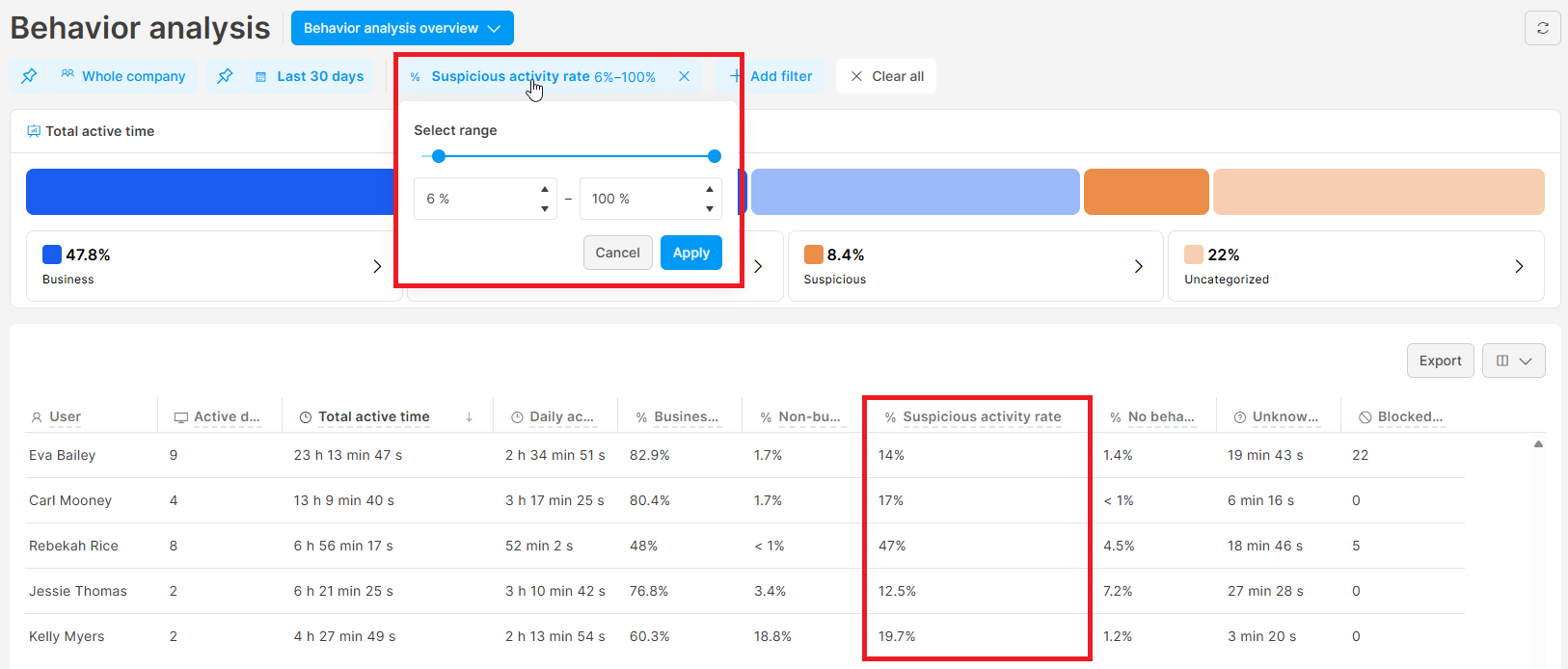 4. Filters: You can filter the table by Behavior category (you can select one or multiple behavior categories), Business activity rate, Non-business activity rate, Suspicious activity rate, No behavior category activity rate, and you can also set up working hours. You can also filter specific users, teams, or devices, and the date range.