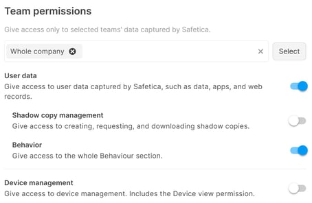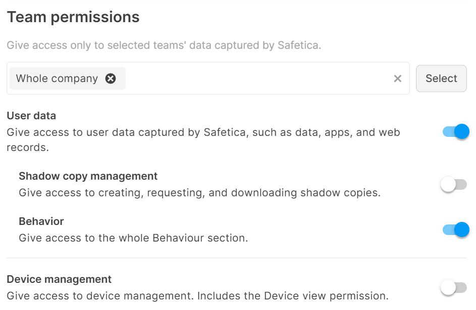 ❗💻Safetica hosted on-premises: The admin account created during onboarding has the Behavior permission granted by default.