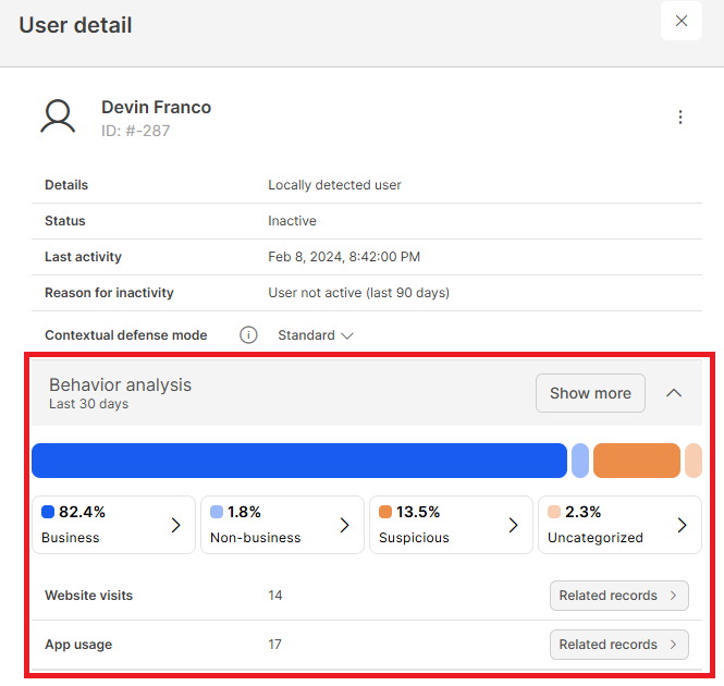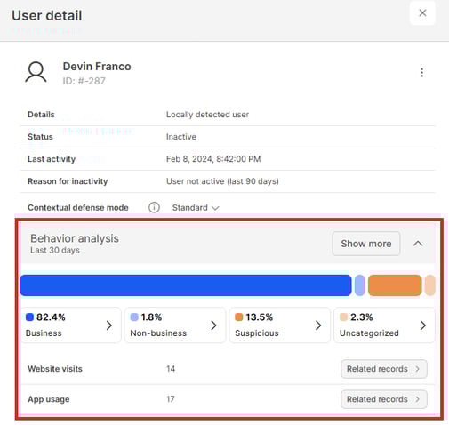- Show more: Displays the user in the Behavior analysis section. The values are shown for the last 30 days.