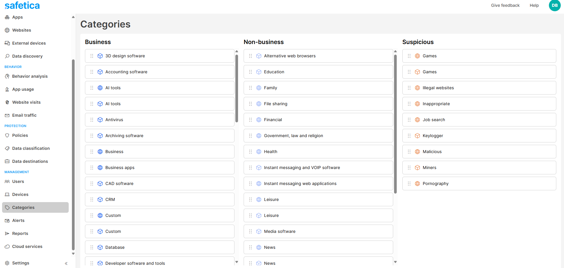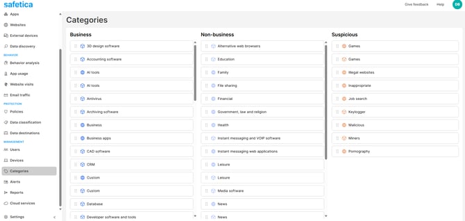 Behavior categories simplify user activity auditing. By organizing app and website categories into clear groups (like Business, Non-business, or Suspicious), you can quickly identify productivity patterns and spot potential security risks across your company.