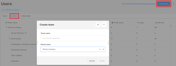 ❗You cannot add new teams into the Unknown team or into teams synced from Active Directory or Entra ID, so you will not see these in the drop-down menu.