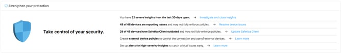 The Dashboard greets you when you sign in and guides you toward stronger, smarter data protection. It shows the most important info about how your company's data is being used and protected and identifies areas for improvement.