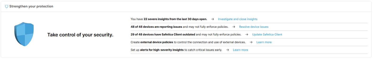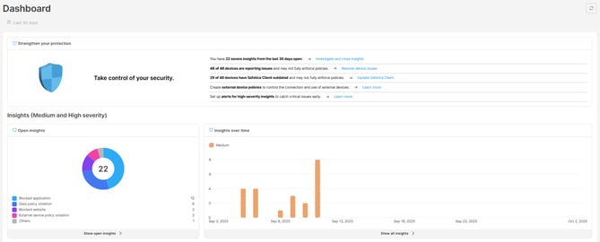 - Open insights: Check how many medium and high-severity insights haven’t been closed yet. They are grouped by the reasons why they were triggered (e.g., Blocked application, Data policy violation, Blocked website, etc.). Click Show open insights to view all open medium and high-severity insights.