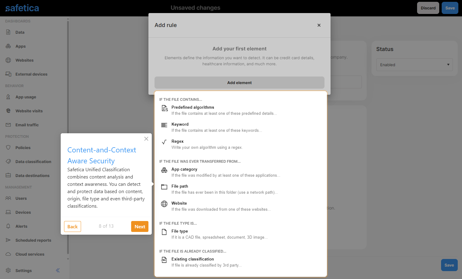 Safetica smart classification combines content analysis with context awareness to detect sensitive data as accurately as possible. It allows you to detect sensitive files based on sensitive content, origin, file type, and even pre-existing 3rd party data classifications.