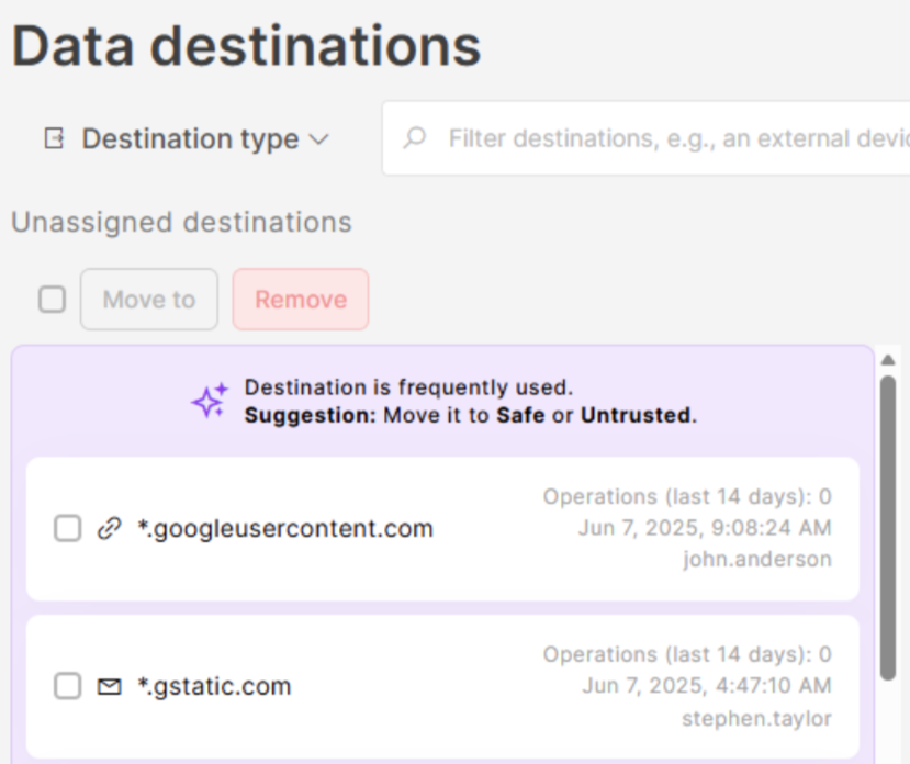 - Suggested destinations appear at the top of the Unassigned list and are highlighted with the message: "Destination is frequently used. Suggestion: Move it to Safe or Untrusted."