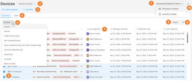 6. Actions: After selecting one or more devices, the Actions drop-down will appear, and you can choose a management action (Update, Restart, Collect device logs, Cancel log collection, Run troubleshooting, Stop troubleshooting and collect detailed logs, Cancel troubleshooting, Deactivate, Uninstall, Move to trash). Only actions applicable to at least one of the selected devices will be visible.