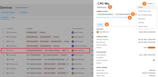 - Update: Update Safetica Client on selected devices to the newest version. Only compatible devices will have Safetica Client updated. Learn more here.