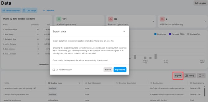 The Do not show again option applies only to the specific admin instance. If the admin signs out and then signs in again, they will see the Export data dialog again.
