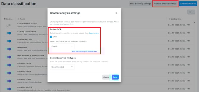 Enable and set up OCR to detect sensitive content in images, photos, and scanned documents. Learn about the limitations of OCR, how to enable/disable OCR globally or for specific devices, and how to select OCR character sets.