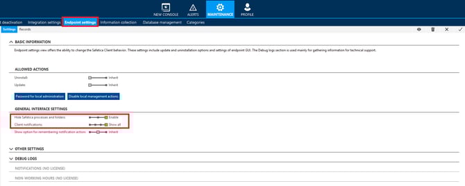 - Under General interface settings, you can set Hide Safetica processes and folders either to Enabled or Disabled.