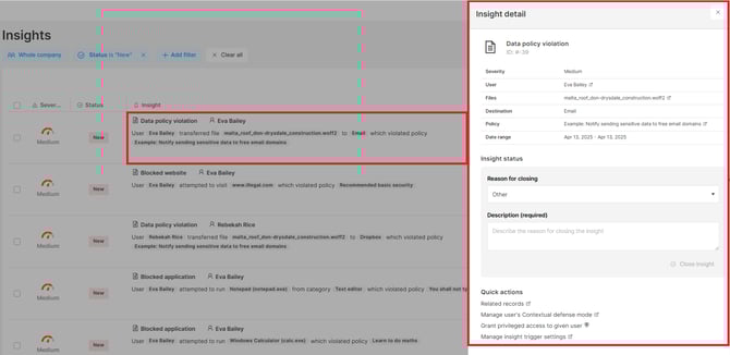 Insight detail: A bridge between the insight and other parts of Safetica console