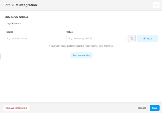 - Add custom headers (optional): For SIEMs that rely on unique authorization headers, you can add Header: Value pairs. Click +Add after entering each pair. Examples: