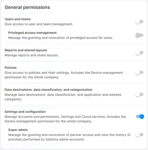- Activate or edit SIEM integration: Only Safetica admins with the Settings and configuration permission can activate or edit the SIEM integration. The permission can be enabled or disabled in Settings > Accounts and permissions.