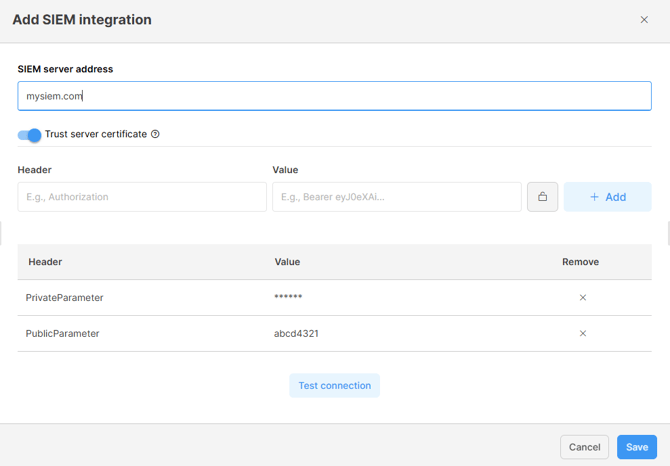 - Trust server certificate: If enabled, the server’s SSL certificate will be accepted without validation. This allows you to securely connect even when your SIEM server uses a self-signed or internal certificate.