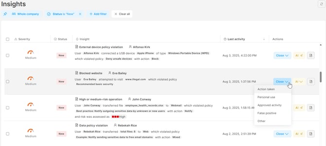 This way, Insights give admins info about what to deal with so that they don't have to click through Safetica console to find security issues.