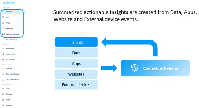 Safetica collects data about operations that occur in the company and runs them through the Contextual Defense engine. Contextual Defense evaluates the data and smartly selects and consolidates important threats, incidents, and events from the Data, Apps, Websites, and External device sections and displays them as insights.