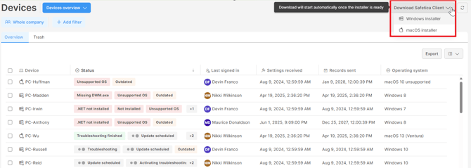 Safetica Client installer can be downloaded from the Devices section in your Safetica console: