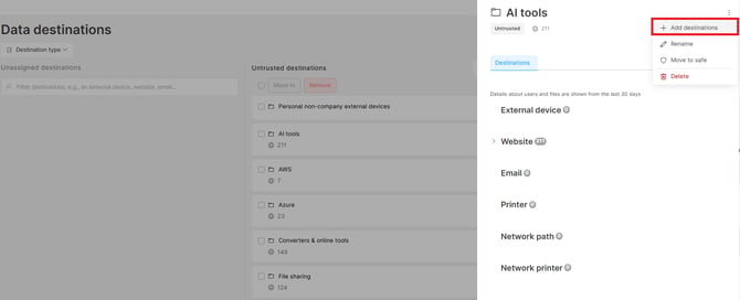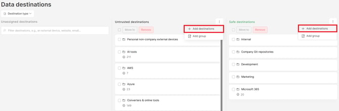 Manually add new destinations (email domains and addresses, websites, network paths, and cloud drives) and divide them into groups for better organization. Use these groups in policies for more granular control.