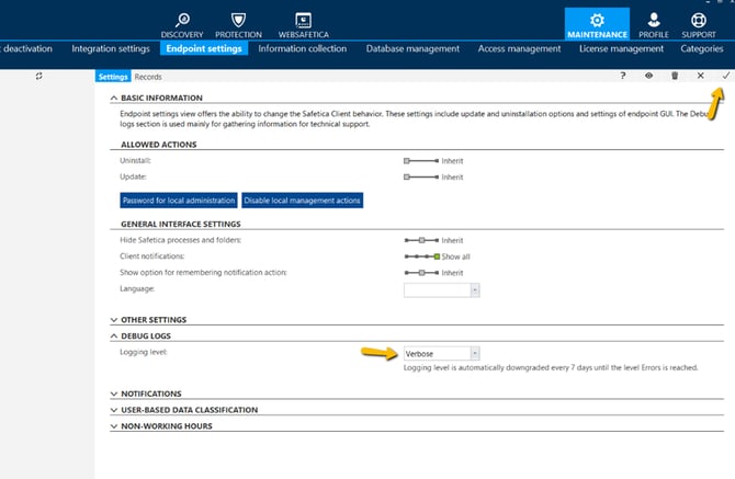 - Change the “Logging level” to “Verbose” and save the change using the confirmation button in the top right corner: