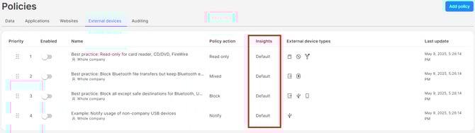 - The Insights setting is available for data, website, application, and external device policies. It is not available for auditing policies.