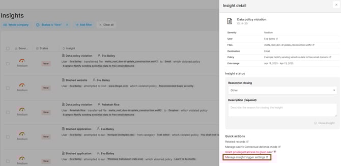 - In Quick actions, click Manage insight trigger settings. This shortcut jumps directly to the specific policy so you can easily adjust how it will trigger future insights.