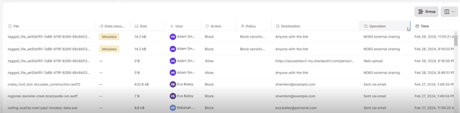 Example: The screenshot below displays an M365 external sharing operation that was blocked based on the Block sensitive data policy. The sharing was done via an anonymous link (Destination is Anyone with the link).