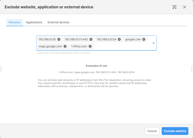 If Safetica disrupts access to a trusted website that doesn’t need protection, admins can whitelist it. Websites or IP addresses can be excluded from SSL/TLS inspection so that Safetica will not affect their secured communication. This is particularly useful for websites that require specific certificates or use HTTP/3. This ensures uninterrupted access for users while maintaining overall security.
