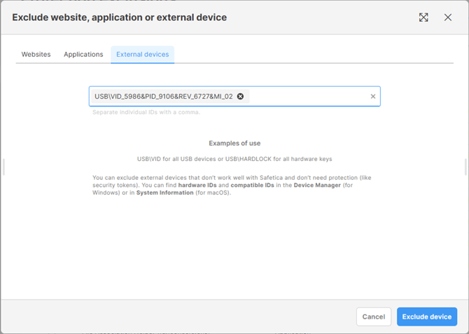You can exclude external devices that do not work correctly with Safetica and don’t need protection (i.e., those without storage). This ensures that external devices with compatibility issues will work for users.
