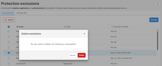 - Select the resources (website, external device, or application) in the Protection Exclusions list.