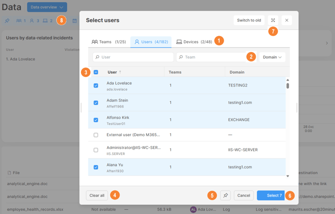 - Select: Confirm your selection with the Select button. You can always see how many users, teams, and devices were selected across all tabs in the filter.