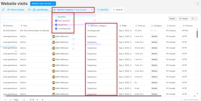 - Filter by behavior category: Choose to investigate Business, Non-business, or Suspicious activities.