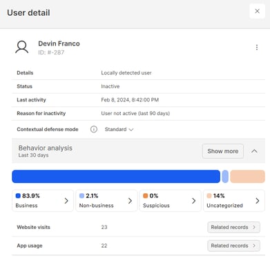 - New activity rate filters in Behavior analysis: You can now select a specific range for Business activity, Non-business activity, or Suspicious activity rate.