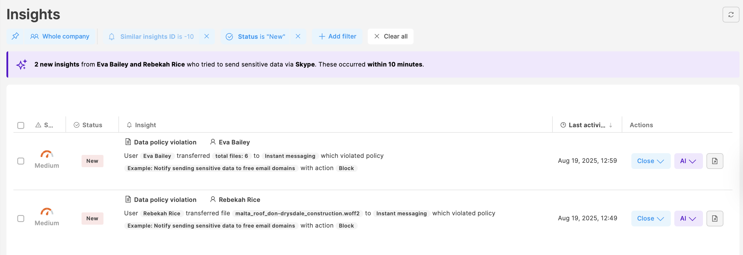 AI summarization for unusual sensitive data activity: AI-powered summarization is now available for Unusual sensitive data activity, helping you quickly assess potential risks.