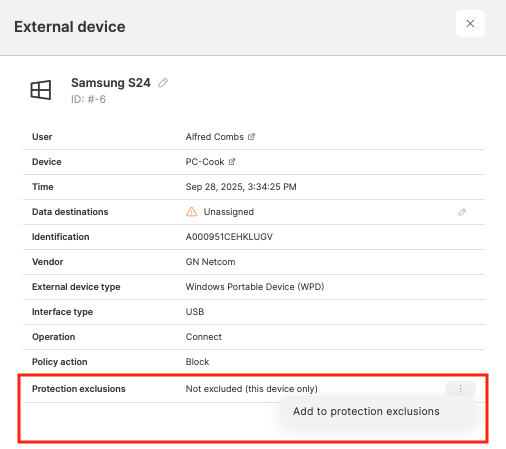 Easier exclusion management for external devices: You can now exclude or remove an external device from Protection exclusions directly from its detail view, making exclusion management faster and more convenient.