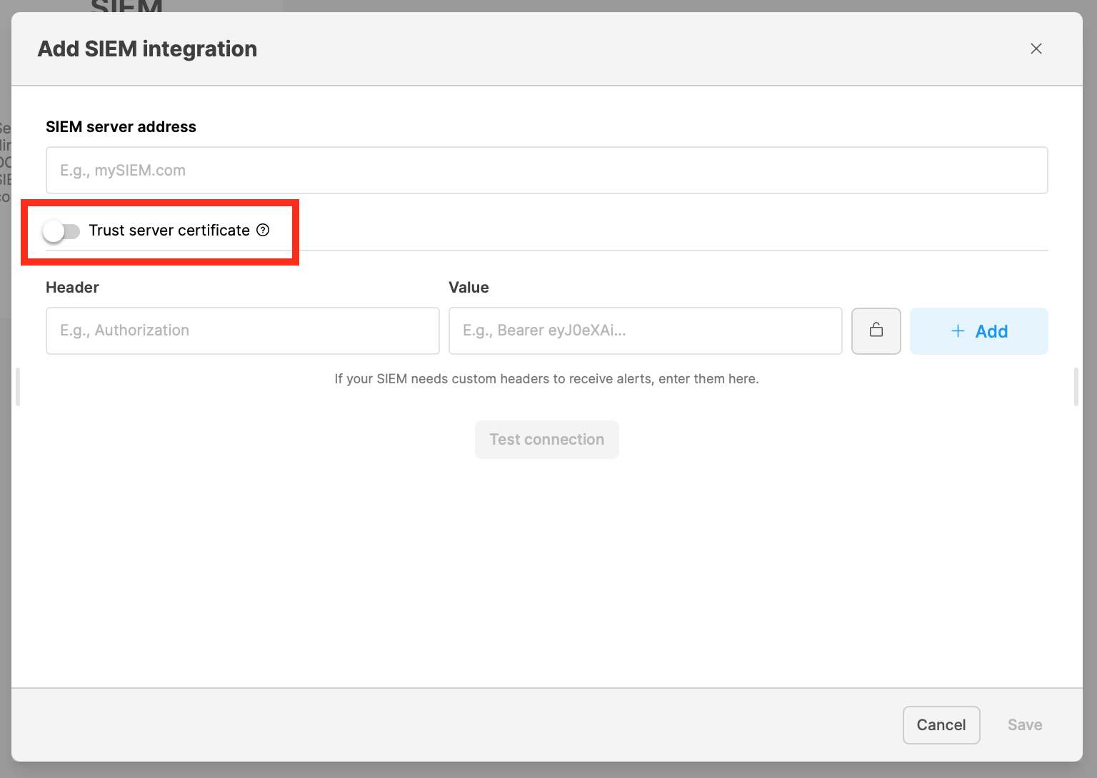 - SIEM integration improvement: We’ve enhanced the SIEM integration setup with a new Trust server certificate option in the SIEM dialog. This allows you to securely connect even when your SIEM server uses a self-signed certificate, making the setup more flexible and reliable.