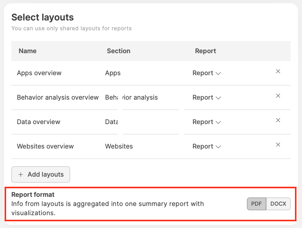 - PDF Reports: One of the most requested features is here! In the Reports section, you can now choose between DOCX (original format) and the new PDF version - featuring an improved structure, graphs (if available in your layout), and data samples for clearer insights. Learn more about creating the new reports here.