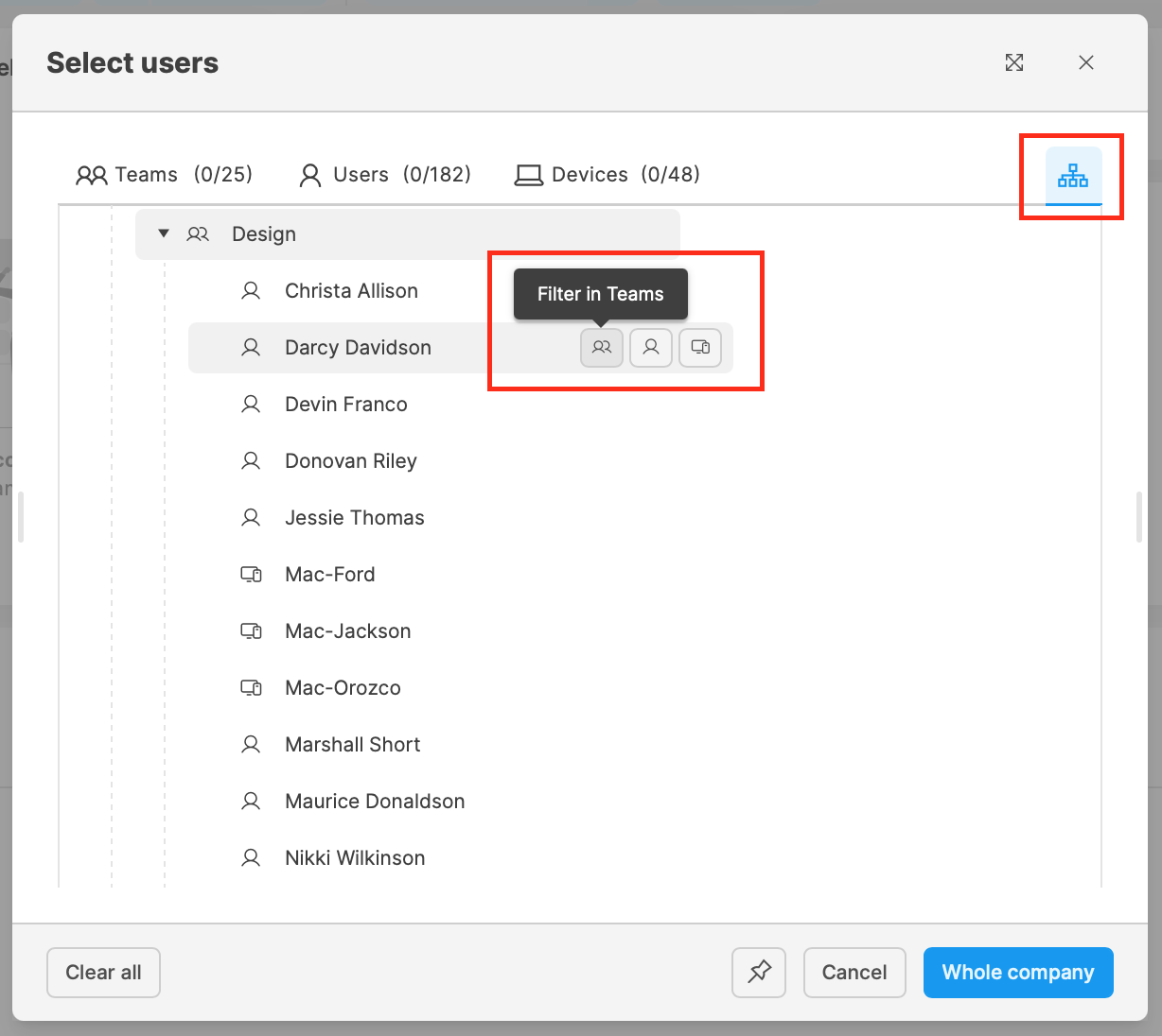 Improved user selector: Searching and filtering is now easier than ever. You can search directly within the tree structure and quickly select what you need across Users, Teams, or Devices tabs.