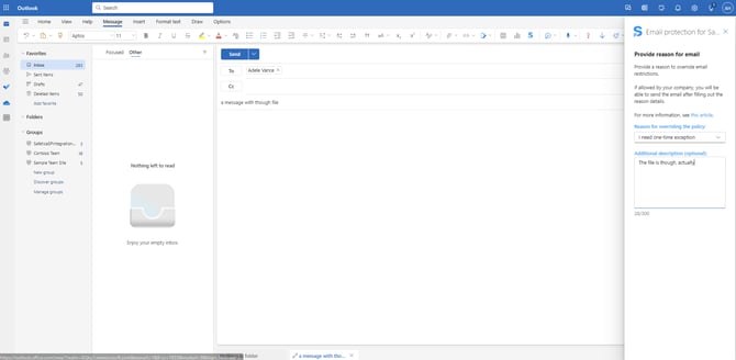 - If you have a block (with override) policy set up for M365 file sharing, and a user shares a file that triggers this policy, the user will receive an email with a link to a form where they can add the reason for overriding the blocking policy.