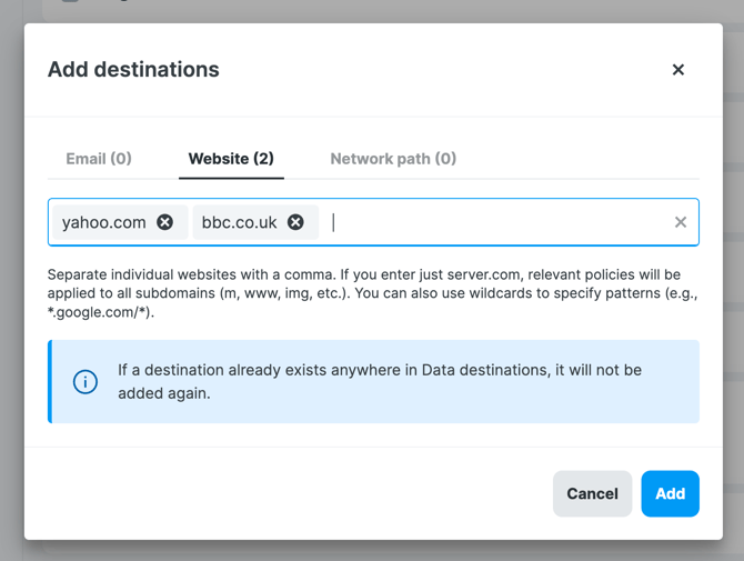 - Data destinations: You can manually add email domains and addresses, websites, and network paths.