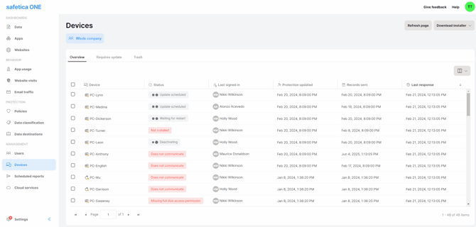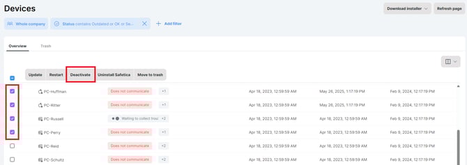 - In Devices, you can deactivate multiple Safetica Clients at once.