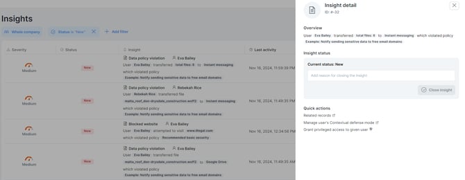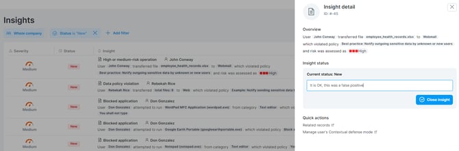 - Close resolved insights: After you finish investigating, close the insight. It will disappear from the insight list, keeping it fresh with unresolved tasks.