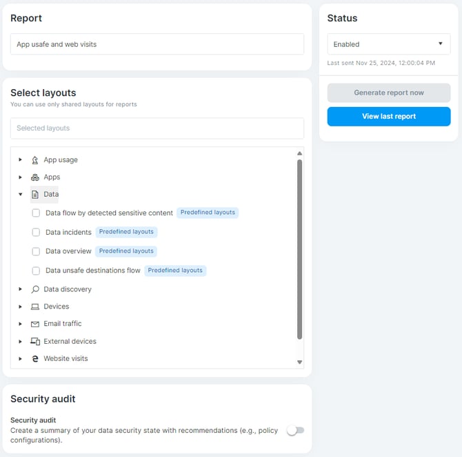 - Layouts - Predefined layouts are now available in all sections with the layout picker. They were prepared by Safetica and cover the most common use cases.