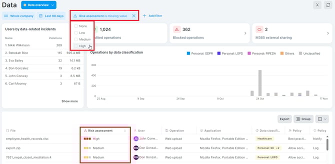 You can also filter out file operations based on risk assessment - click the Add filter button, select Risk assessment, and then select High, Medium, Low, or None.