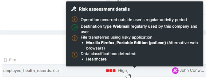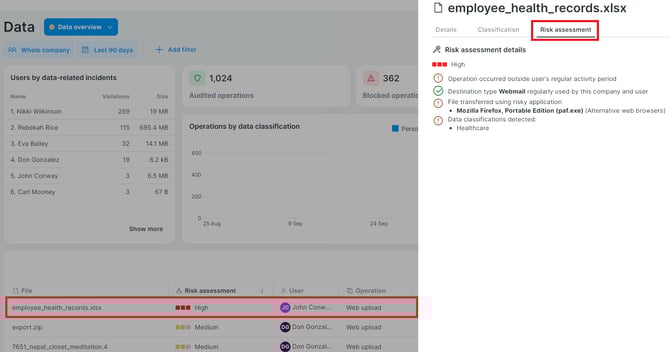 To see how risky individual file operations were, go to the Data section and look at the Risk assessment column. Risk assessment is indicated by colors: