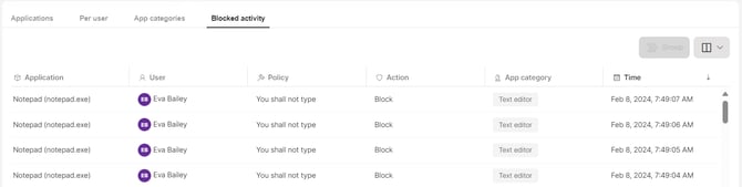 Records of blocked website visits can be found in the Websites section in the Blocked activity tab.