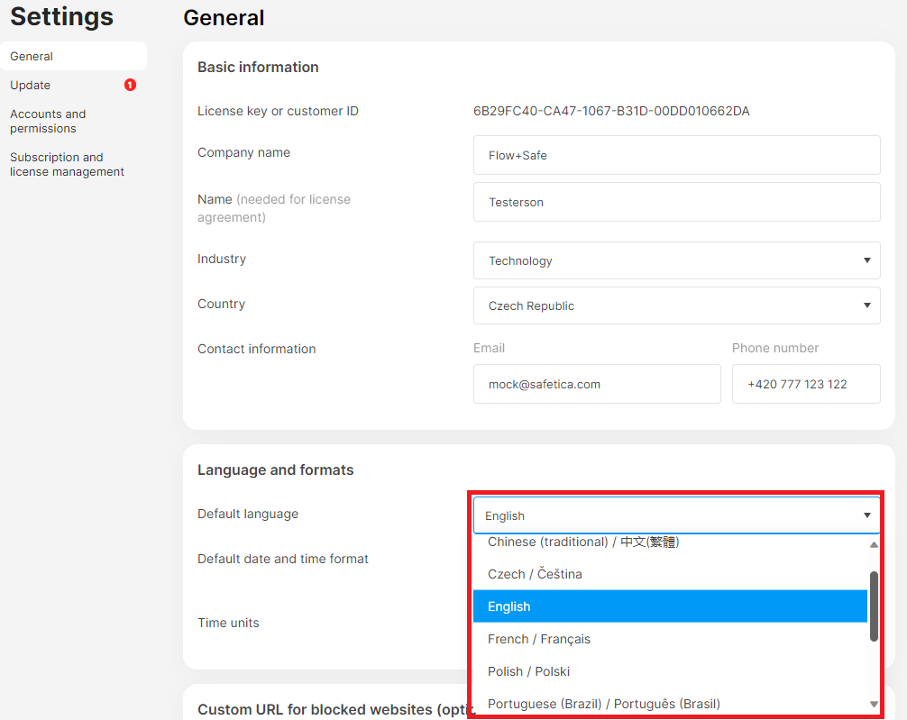 Languages supported in Safetica console