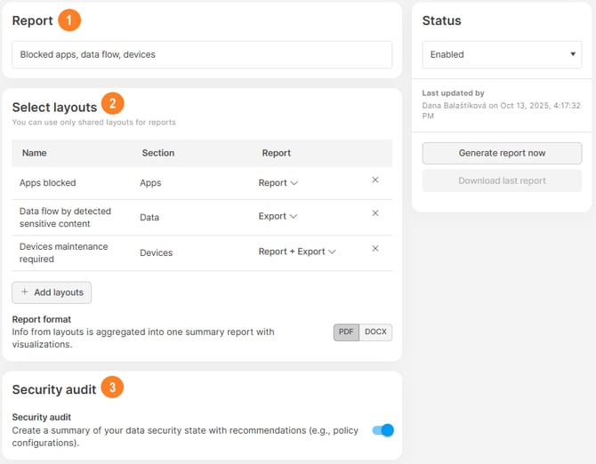 3. Security audit (optional): You can include the Security audit – a document summarizing Safetica’s security findings, observations, and suggestions for mitigating security risks using Safetica's capabilities (e.g. policy configuration tips).