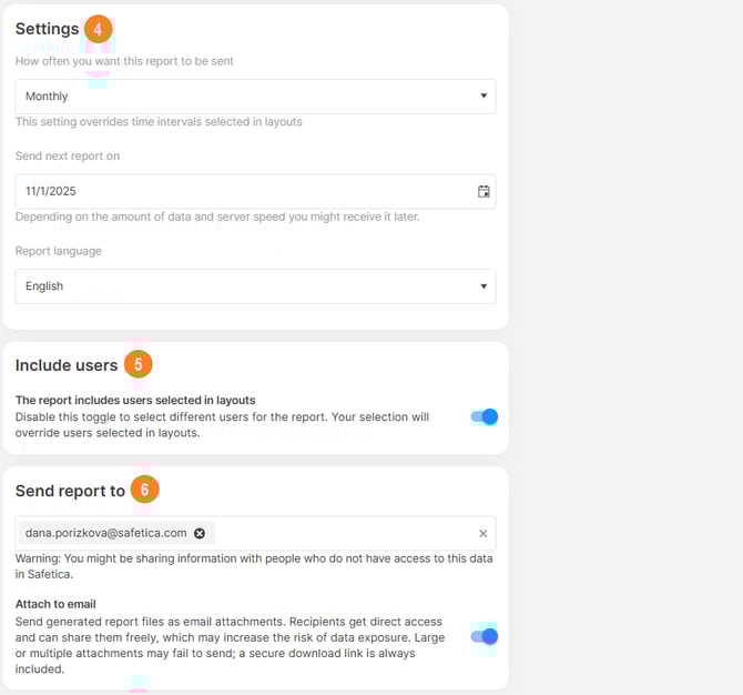 4. Settings: Decide how often and in what language the report should be created. The report’s date range is not inherited from layouts – the interval selected here will be used in the report (daily, weekly, monthly, or quarterly).