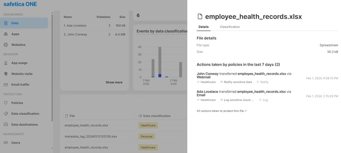 - Operations by data classification: Find out what data types were moved around, at what times, and in what amounts. Delve into a specific data classification (e.g. personal data) and see what specific data were moved on specific days.